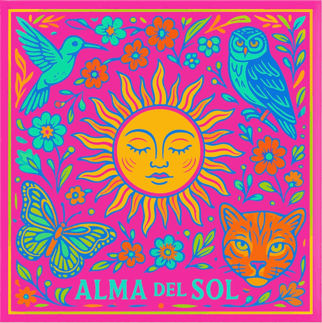 “Juliette” incarne la force douce du soleil intérieur. Son fond rose vibrant est illuminé par un astre central rayonnant, entouré de fleurs éclatantes, d’un papillon gracieux et d’un regard félin perçant.