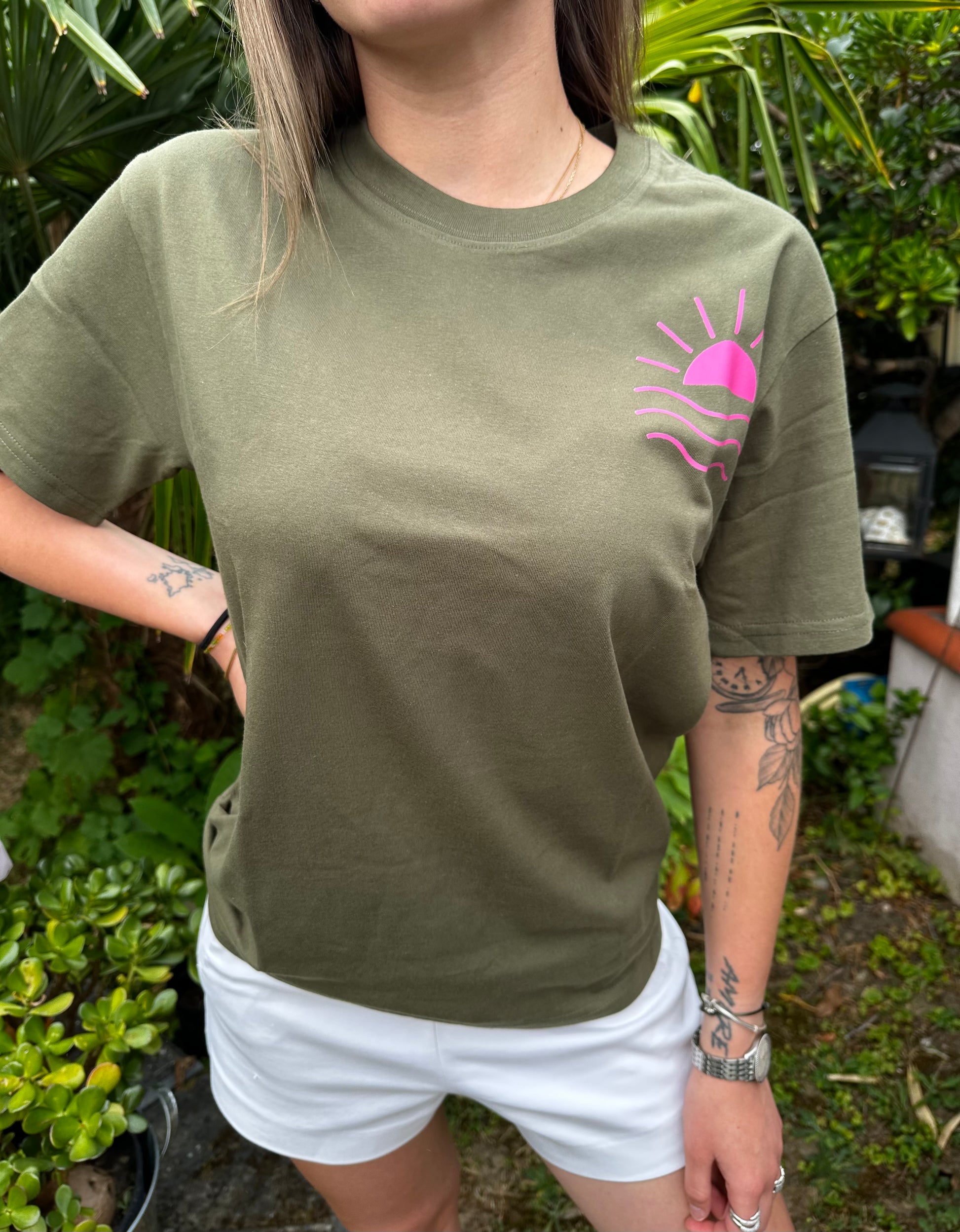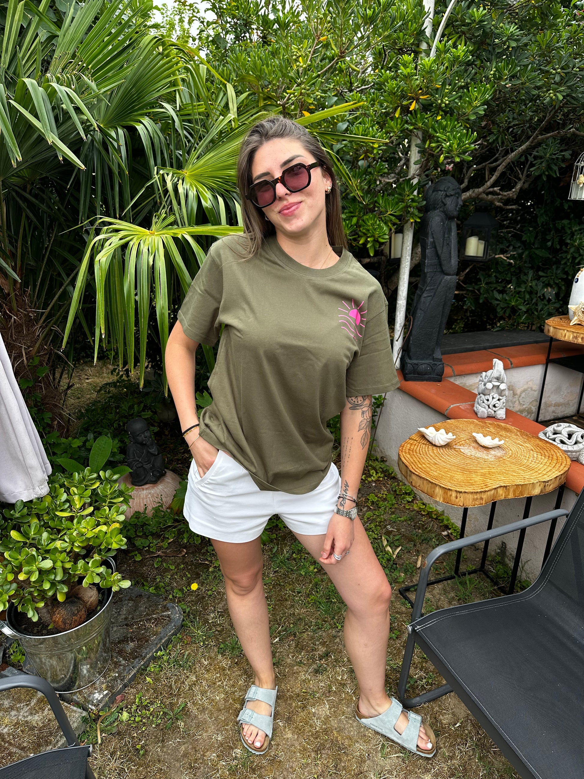 ✨ Petite imperfection, grande transparence : sur cette version kaki, un contour blanc discret est visible autour du motif. Ce détail n’était pas prévu, mais nous avons décidé de conserver cette pièce telle qu’elle est unique, imparfaite et toujours aussi solaire.