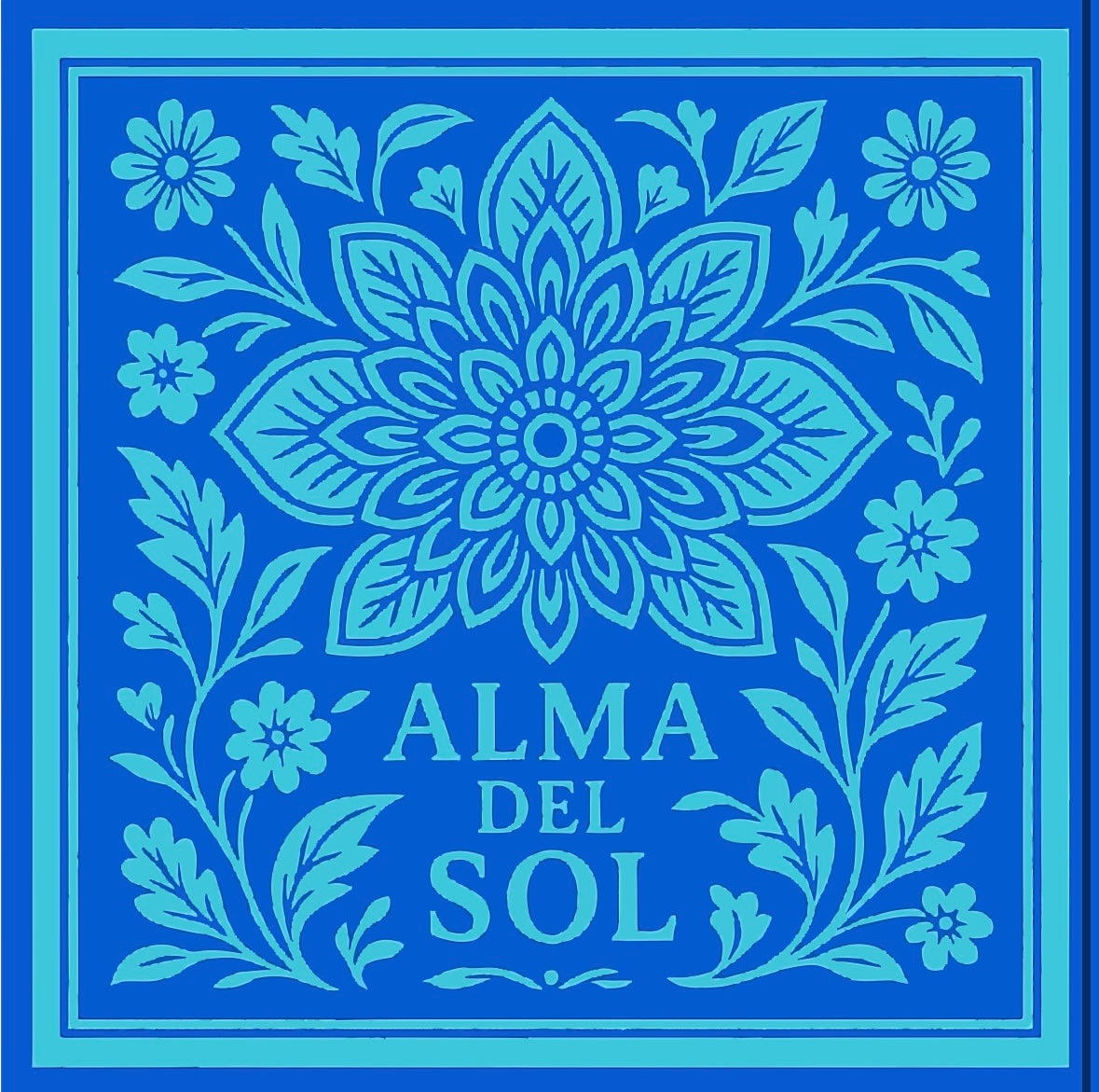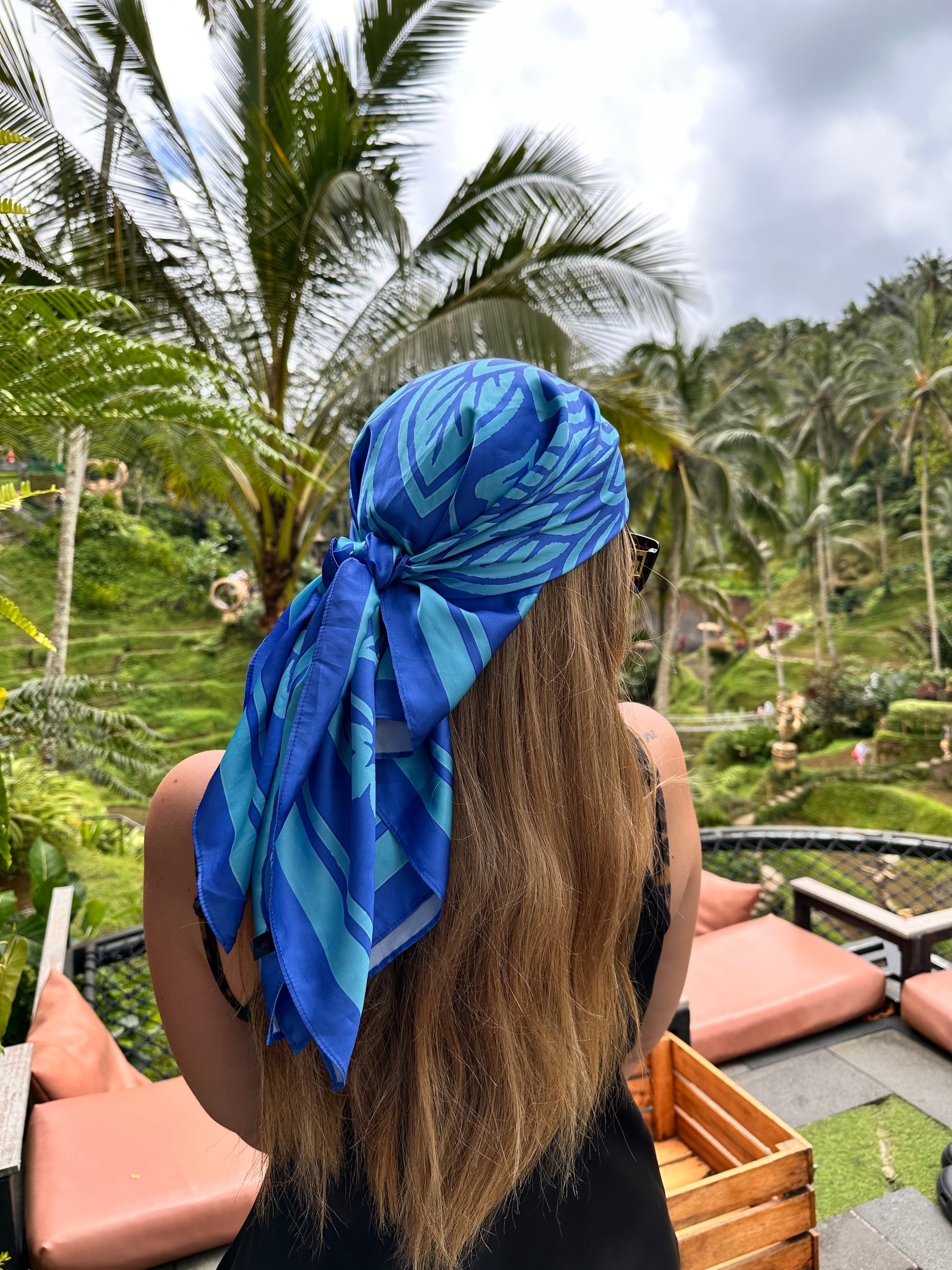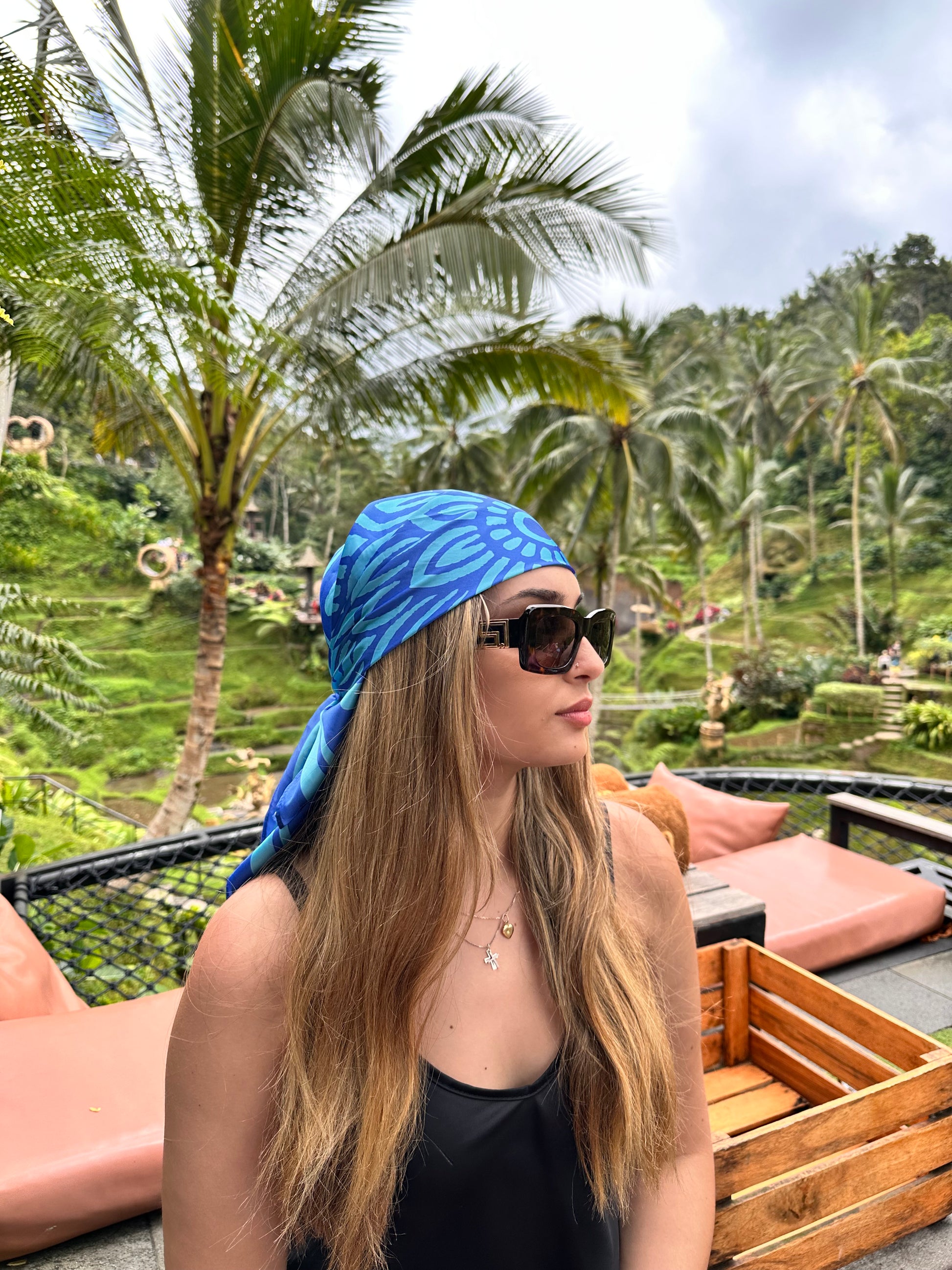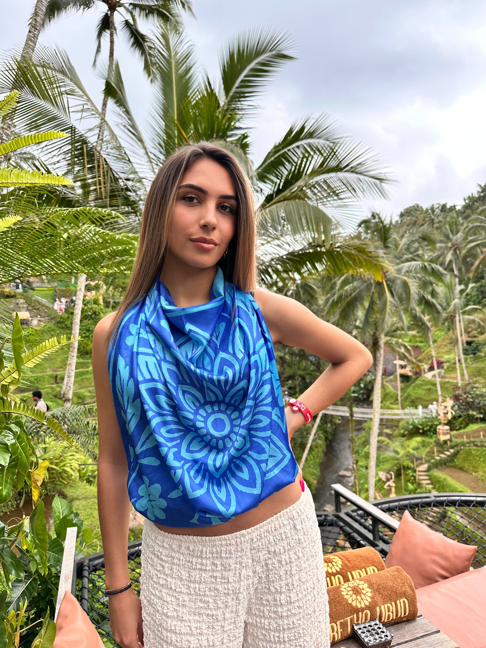 "Sofia" évoque la pureté du ciel avec son fond bleu électrique puissant, délicatement brodé de fleurs stylisées en mandala.